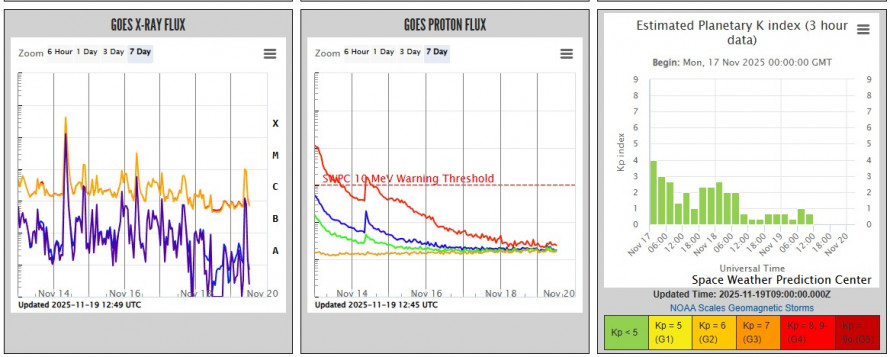 - SpaceWeatherLive.com (актуальний 3-денний прогноз на 19–21 листопада) — максимальний Kp = 4.00 наприкінці доби 21 листопада. Геомагнітних штормів G1 та вище не прогнозують.