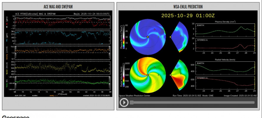 Однак, за інформацією з SpaceWeather.com, існує низька ймовірність слабого геомагнітного шторму класу G1 (K-індекс близько 5) через можливе прибуття коронального викиду маси з Сонця, запущеного 23 жовтня. Моделі NASA передбачають прямий удар CME по Землі 26-27 жовтня, але це прогноз з низькою впевненістю через перекривання кількох викидів. Інші джерела, як-от RBC-Україна, також підтверджують стабільність з K-індексом 2-3, але радять стежити за оновленнями.