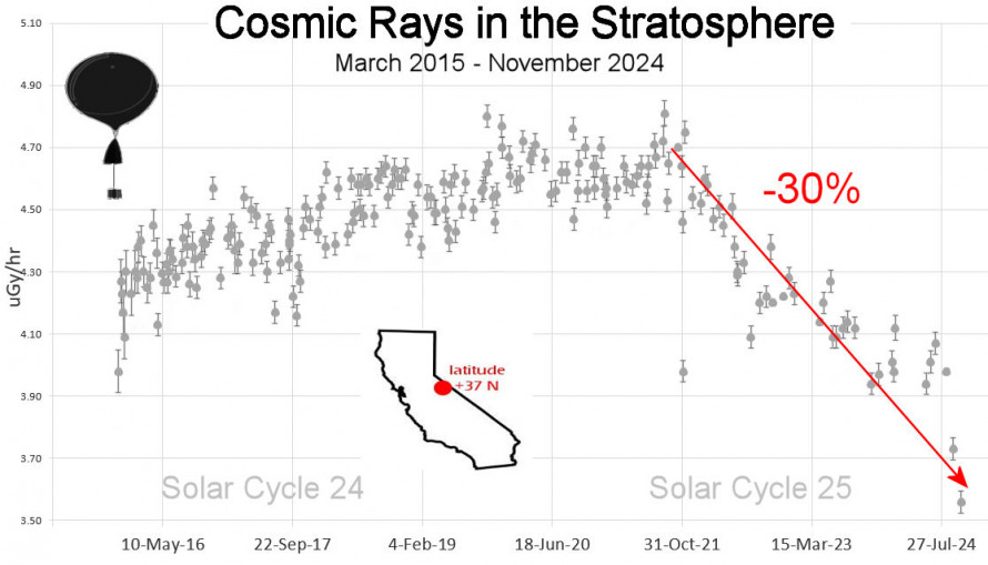 За даними NOAA, 27 листопада очікується можлива геомагнітна активність на рівні G1 (слабка буря) через вплив швидких потоків сонячного вітру з корональної діри (CH HSS). Максимальний Kp-індекс може сягнути 5, з періодами від 3,67 до 4,00 протягом доби. Ймовірність G1-бурі становить близько 15-20% на середніх широтах, з можливими полярними сяйвами на високих широтах.