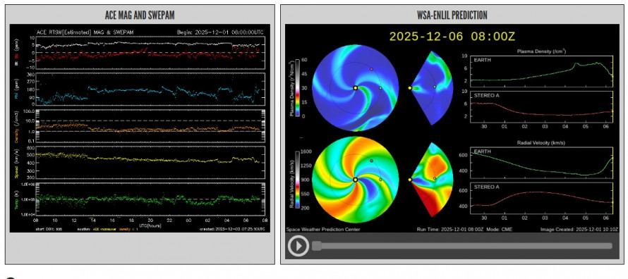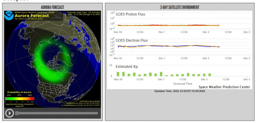 Згідно з SpaceWeatherLive, максимальний очікуваний індекс Kp на 3 грудня — 4, що відповідає нестабільній геомагнітній ситуації, але без значних штормів рівня G1 або вище. Не прогнозується суттєвих сонячних вітрів чи транзитних подій.