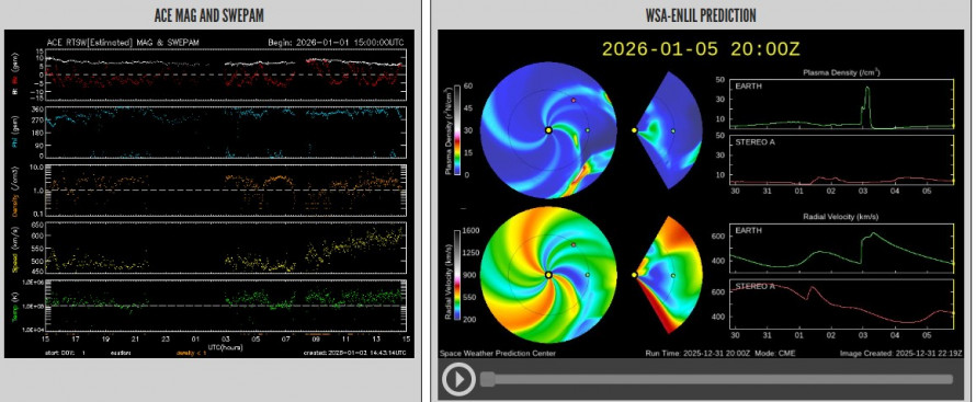 - NOAA та Space Weather Prediction Center: Прогнозують можливі слабкі (minor) геомагнітні бурі на 4-5 січня, пов'язані з залишковими ефектами CME від попередніх днів. Рівень Kp може сягнути 4-5, що відповідає G1 (слабка буря). Раніше, на 1-3 січня, видано попередження про G1-G2 бурі.