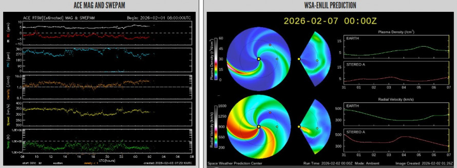 Офіційні прогнози NOAA SWPC та SpaceWeatherLive на найближчі дні (станом на початок лютого) показують переважно тихі/спокійні умови (Kp 0–2 у 3-day forecast), без сильних штормів у перші дні місяця. Ймовірність G1 або вище низька (5–10% для середніх широт). Активніші періоди можливі пізніше (4–5 лютого Kp=4 за деякими прогнозами, 13 лютого G1).