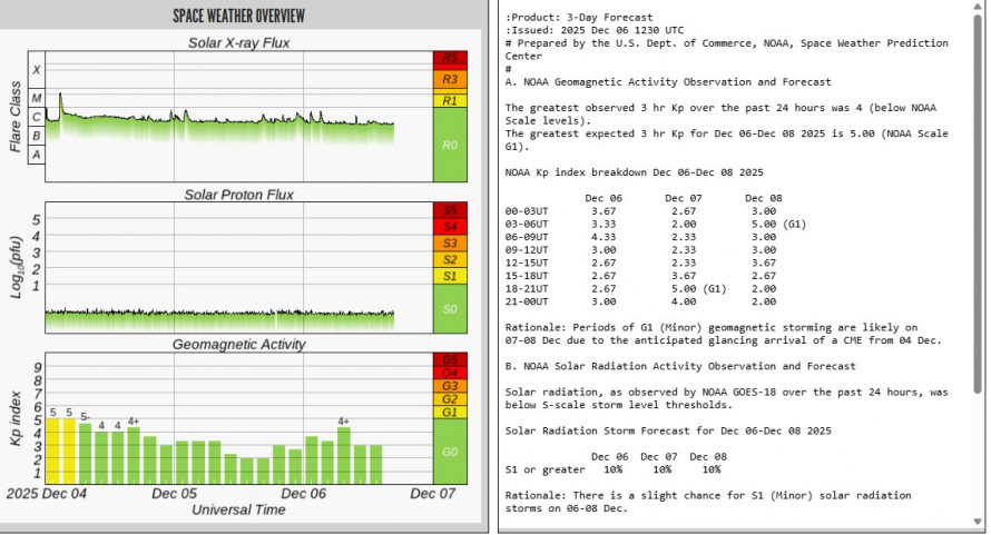 Згідно з прогнозами, 8 грудня геомагнітна активність буде підвищеною, але не критичною. Очікується буря рівня G1 (слабка/середня), з максимальним Kp-індексом до 5. Це означає можливі коливання магнітного поля протягом дня, особливо в ранкові години (03-06 UTC, що відповідає 05-08 за київським часом).