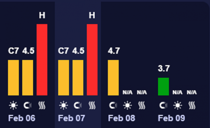 За прогнозом, у неділю, 8 лютого, очікується сонячна активність з К-індексом 4,7 (жовтий рівень), що відповідає середнім магнітним бурям. Ці данні базується, які надав Центр прогнозування космічної погоди (SWPC) NOAA. Вимірюється геомагнітна активність за шкалою від 0 до 9. Для позначення використовується планетарний К-індекс, якщо показник 5 і вище – то це сильна магнітна буря.