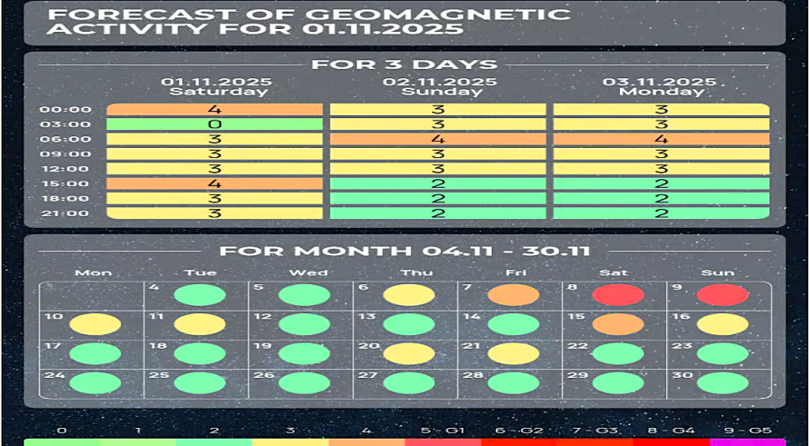 Очікується, що індекс Kp сягатиме значень 5-6, що відповідає слабкій або середній бурі рівня G1-G2 за шкалою NOAA.