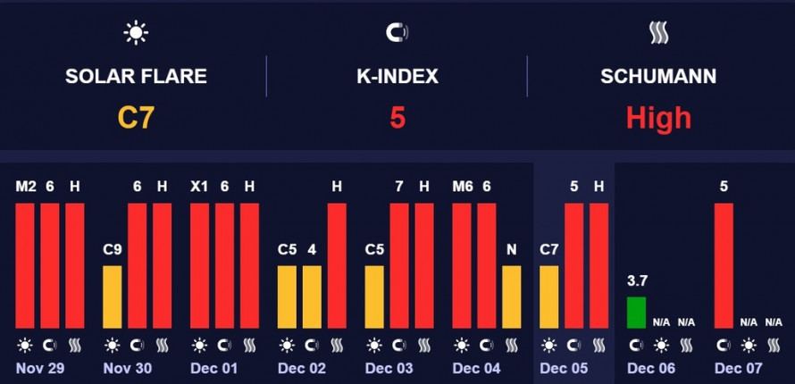У суботу, 6 грудня, на Землі очікується сонячна активність з К-індексом 3,7 (зелений рівень), що відповідає слабким магнітним бурям