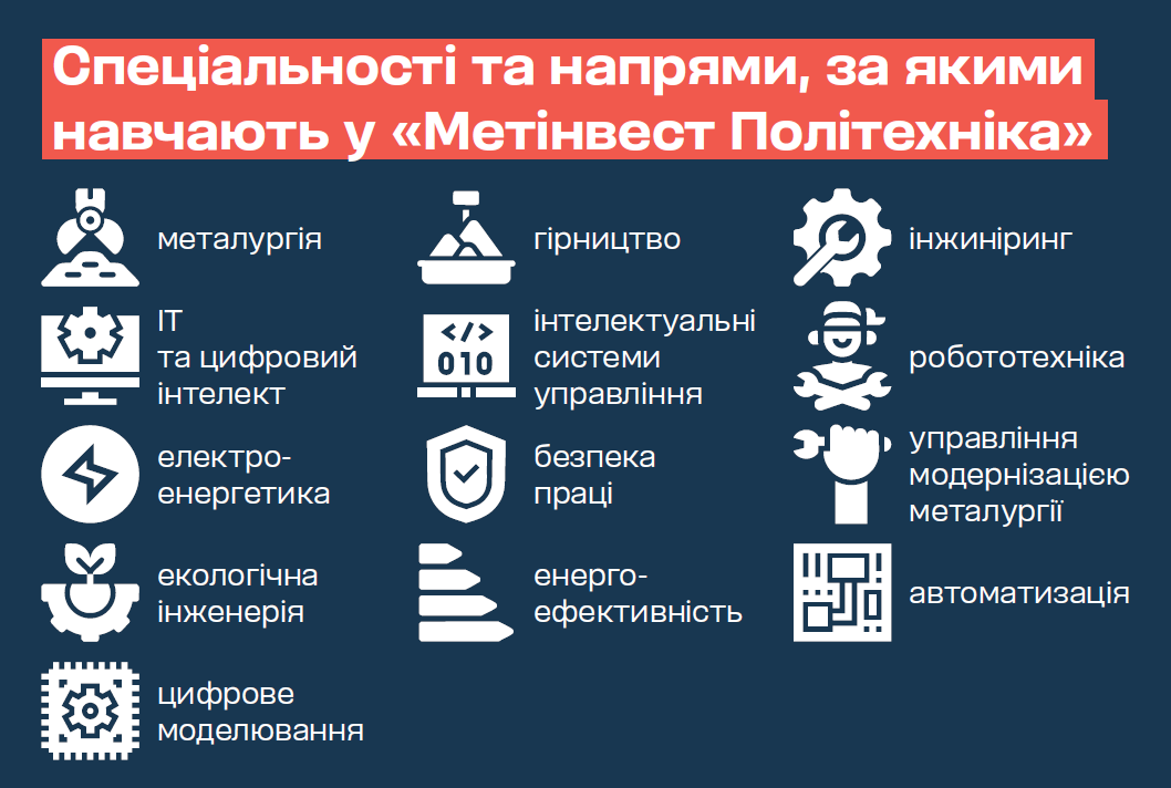 Ключові напрями підготовки охоплюють металургію, гірництво, інжиніринг, ІТ та цифровий інтелект, інтелектуальні системи управління, робототехніку, електроенергетику, безпеку праці та управління модернізацією металургії. «Ми постійно вдосконалюємо програми та створюємо нові в тісній співпраці з Групою, – пояснює Олександр Поважний. – Гнучкість до технологічних та ринкових змін – наш пріоритет».