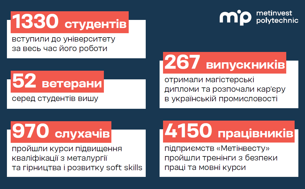 Наразі Метінвест Політехніка працює в Запоріжжі, Кривому Розі й Кам’янському, поєднуючи онлайн‑лекції та практику на виробничих майданчиках підприємств Метінвесту. Понад 267 магістрів вже отримали дипломи та будують кар’єру в українській промисловості. Це стратегічний актив Групи Метінвест, який поєднує фундаментальну освіту, науку та практику.
