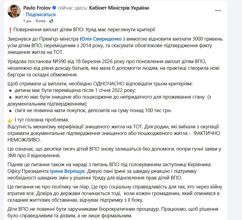 18 березня 2026 року Кабінет Міністрів ухвалив постанову №390, яка мала б спростити процес повернення виплат дітям ВПО у розмірі 3000 гривень незалежно від доходу батьків. Проте на практиці документ запровадив жорстку систему фільтрації. Для отримання допомоги родина повинна відповідати одночасно трьом критеріям: