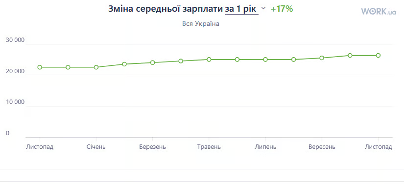 Наразі середня зарплата в Україні становить 26 300 грн — це на 17% більше, ніж рік тому.