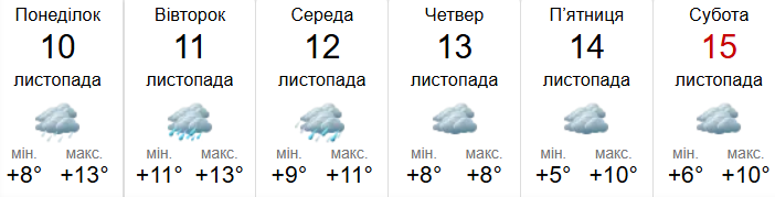 Четвер, 13 листопада, денна температура суттєво знизиться і становитиме лише +8°C, а нічна - також +8°C. Очікується хмарна погода з невеликими опадами.