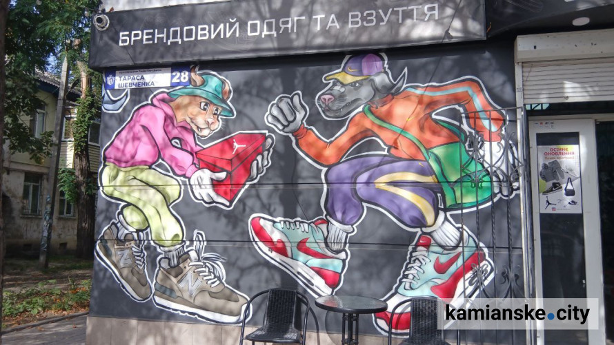 Ще один магазин із продажу одягу та взуття на проспекті Тараса Шевченка також обрав креативне оформлення фасаду. Це мистецьке рішення зробило заклад значно привабливішим і впізнаваним для свого бренду.