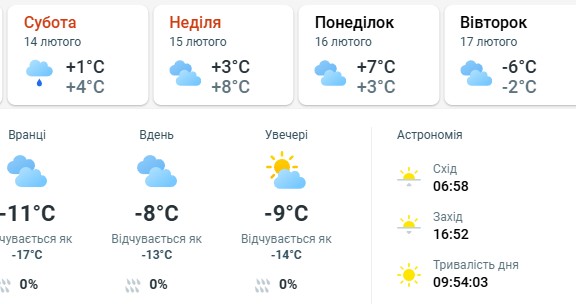 Астрономічні дані: Світловий день продовжує поступово збільшуватися. Схід сонця очікується о 06:58, а захід — о 16:52. Загальна тривалість дня складе майже 10 годин.