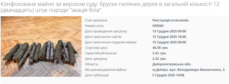 У Дніпрі держвиконавці вилучили в боржника 12 брусків акації та відправили їх на торги в OPEN MARKET - лот миттєво став сенсацією мережі.
