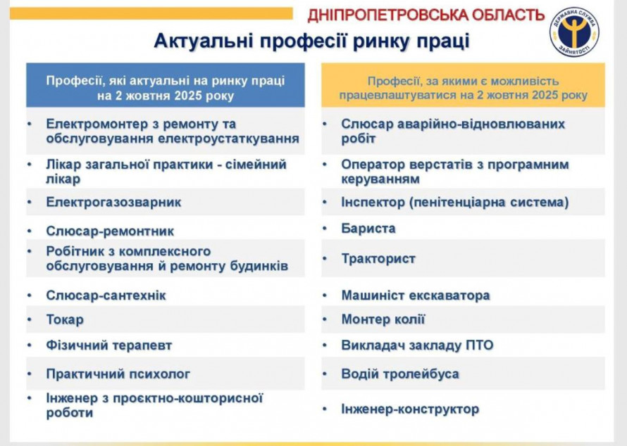 - Наразі актуальні такі професії: електромонтер з ремонту та обслуговування електроустаткування, лікар загальної практики - сімейний лікар, електрогазозварник, слюсар-ремонтник, робітник з комплексного обслуговування та ремонту будинків, слюсар-сантехнік, токар, фізичний терапевт, практичний психолог, інженер з проєктно-кошторисної роботи.