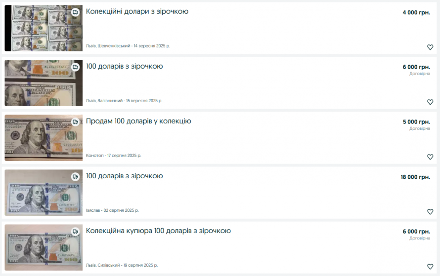 На платформі OLX багато оголошень про продаж нетипових доларів. Наприклад, користувач із Кривого Рогу пропонував 100 доларів із зірочкою за 6500 грн — це на 58% дорожче за курс. Подібні пропозиції численні, тож власники можуть пошукати покупця серед колекціонерів перед обміном. Альтернатива — зберегти купюри, адже з часом їхня цінність може зрости залежно від рідкості серії та стану.