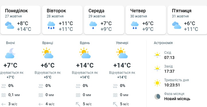 Четвер, 30 жовтня Температура продовжить знижуватися. Вночі — +6°C, удень — близько +9°C. Переважно хмарно, опадів небагато, але відчуватиметься осіння прохолода.