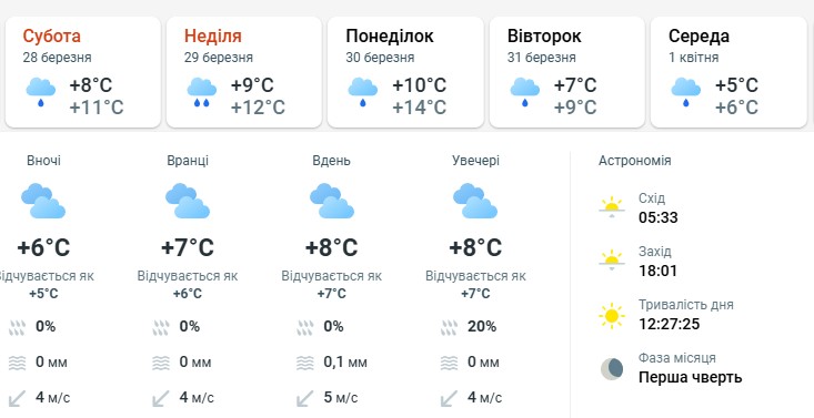 Прогноз на суботу, 28 березня