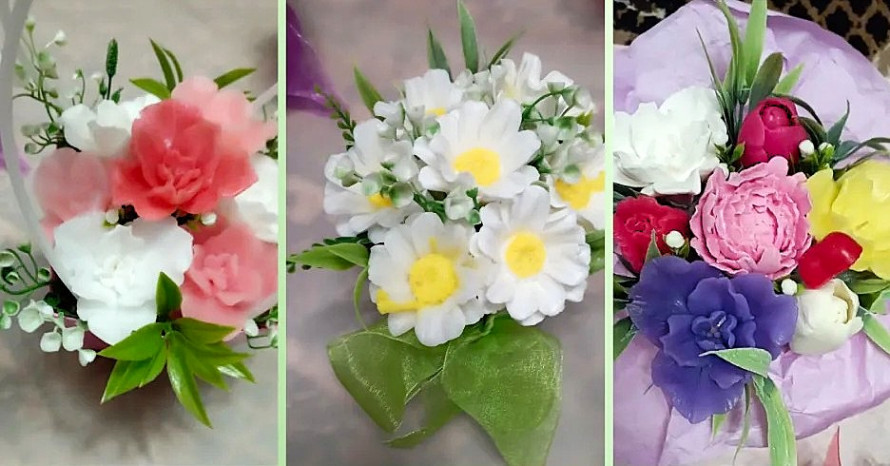 Процес створення мила займає різний час. Простий виріб можна зробити за одну-дві години. Але складні композиції, особливо квіткові букети (на фото), потребують значно більше зусиль: спочатку створюються окремі елементи, а потім вони об’єднуються в єдину композицію.