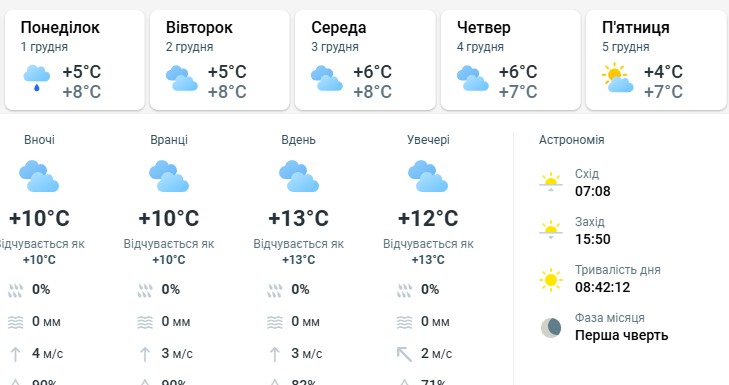 | Понеділок | 1 грудня | +5°C | +8°C |
