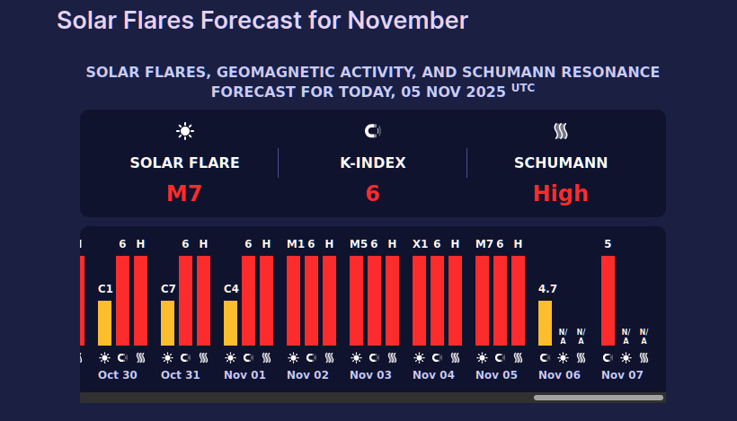 В четвер, 6 листопада, магнітосфера буде збудженою, а ближче до ночі може початися повноцінна магнітна буря. Попередньо її оцінюють як G1 (слабка), але інтенсивність може виявитися вищою, адже останнім часом прогностичні моделі часто недооцінюють силу сонячних викидів. Тривалість бурі може становити орієнтовно до 9 годин.