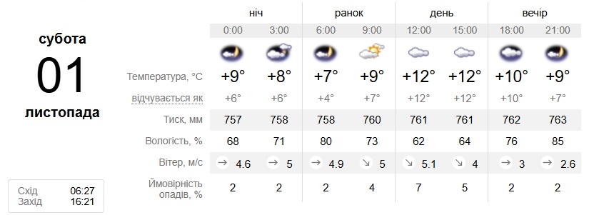 У суботу, 1 листопада, за прогнозами синоптиків, буде хмарно, але без значних опадів. Температура вдень коливатиметься від +9 °C до +12 °C, уночі стовпчики термометрів опустяться до +7 °C. Вітер західний, помірний (близько 3-5 м/с). Атмосферний тиск — близько 764 мм рт. ст.