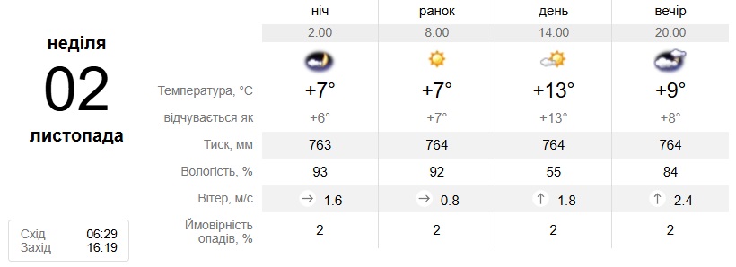 У неділю, 2 листопада, очікується переважно хмарна погода, але без опадів. Температура вдень підніметься до +13 °C, а вночі стовпчики термометрів коливатимуться близько +7 °C. Вітер південний, легкий (близько 1-2 м/с). Атмосферний тиск — близько 760 мм рт. ст.