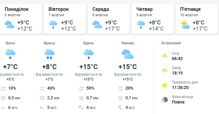 Температурний фон залишиться майже без змін: вночі близько +9°C, вдень до +12°C. Небо буде переважно похмурим, сонце з’являтиметься нечасто.
