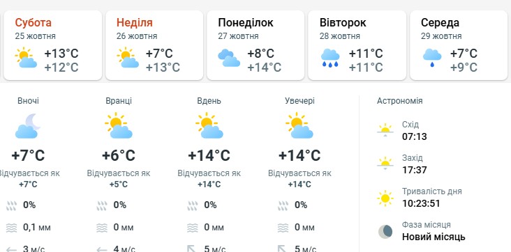 Субота, 25 жовтня, весь день буде хмарним. Уночі очікується дощ, але вранці опади припиняться, і протягом дня їх не передбачається. Денна температура сягне +13°C, нічна опуститься до +12°C. Вітер змінної сили, до 7 м/с, вологість 65-95%, ймовірність опадів удень мінімальна (до 2%).