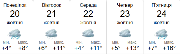 Понеділок, 20 жовтня, принесе невеликий дощ, денна температура становитиме лише +8°C, а нічна - +4°C. Вітер буде західний, доволі сильний, до 19 км/год.