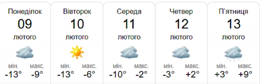 - Понеділок, 09 лютого, хмари, що вкривали небо у Кам'янському вранці, вдень зникнуть, і до самого вечора вони вже не з'являться. Без опадів. Денна температура становитиме до -9°C, а нічна опуститься до -13°C.