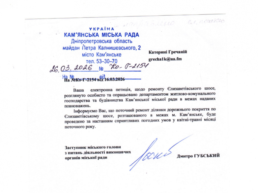 «Поточний ремонт ділянки дорожнього покриття по Єлизаветівському шосе, розташованого в межах м. Камʼянське, буде проведено за настанням сприятливих погодних умов у квітні-травні місяці поточного року» - відповідь від Кам’янської міської ради.