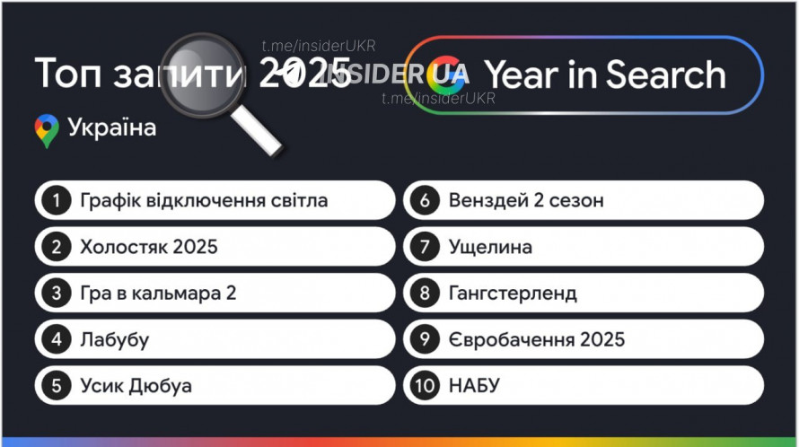 Зазначається, що першу сходинку загального рейтингу, як і торік, посів запит «Графік відключення світла». На другій позиції опинився телепроєкт «Холостяк 2025», на третій - серіал «Гра в кальмара 2». До першої десятки також увійшли запити: «Лабубу», «Усик - Дюбуа», «Євробачення 2025», «НАБУ».