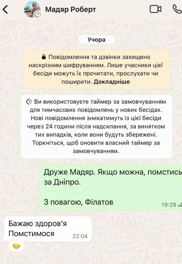 Командувач СБС Роберт «Мадяр» Бровді надіслав коротку, але вичерпну відповідь на звернення мера Філатова: «Бажаю здоров'я, помстимося».