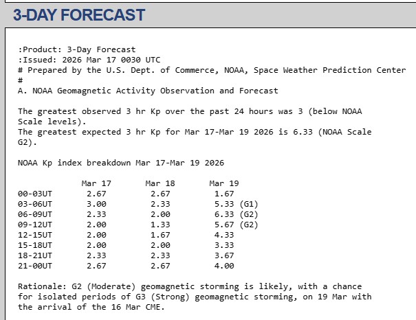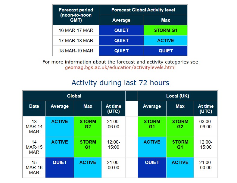 За прогнозом науковців British Geological Survey Geomagnetism, нещодавно вибухнув великий філамент із пов’язаним із ним викидом корональної маси (CME). Цей CME має спрямований на Землю компонент і відчутно впливатиме на геомагнітне поле 16−17 березня з можливим продовженням 18 березня. У вказаний період триватиме магнітна буря STORM G1.
