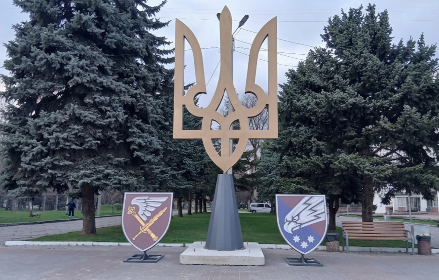 Цей монумент - не просто архітектурна форма. Це мандрівний символ «Тризуб», створений на початку 2026 року за ініціативи 7-го корпусу ДШВ та 25-ї окремої повітрянодесантної Січеславської бригади. Поряд із головним гербом встановлено пам’ятні щити з емблемами тих, хто ініціював цей проєкт.