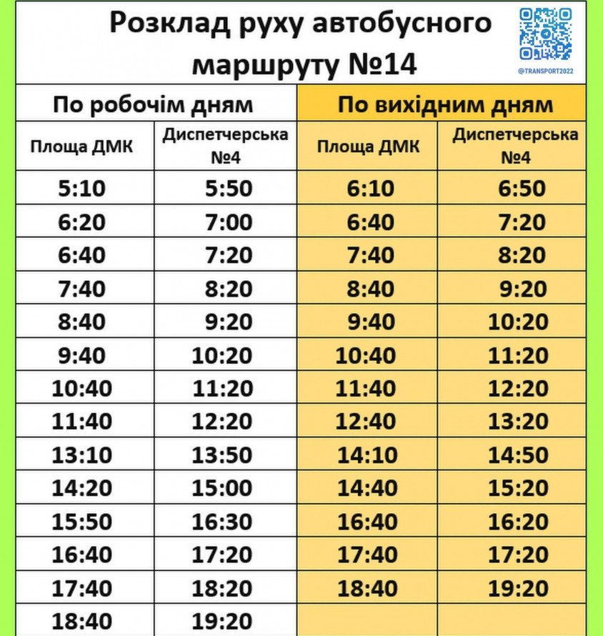 Актуальний графік руху автобуса №14 на робочі та вихідні дні