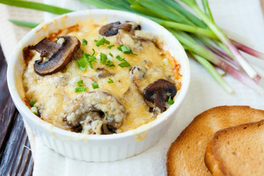 Ніжне куряче філе, соковиті гриби та тягнуча сирна шапочка під золотистою скоринкою — ця страва завжди викликає захват. Готується дуже просто, а подається в кокотницях або в одній великій формі. Ідеально як гаряча закуска до святкового столу чи затишної вечері.