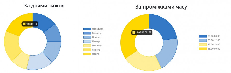 Якщо аналізувати день та час, коли оголошувалися тривоги в Дніпропетровській області, то у лютому це була неділя (16 разів), а найменше – вівторок (6 разів), за часом у вечірний час - з 18:00 до 00:00 годин.