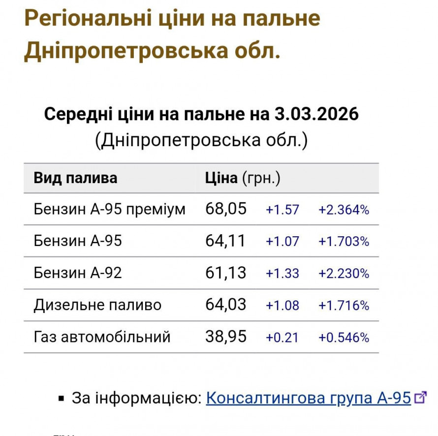 Ситуація в Кам’янському загалом корелює з середньообласними показниками. За даними Консалтингової групи «А-95», станом на 3 березня 2026 року середні роздрібні ціни в Дніпропетровській області продемонстрували добовий ріст за всіма позиціями:
