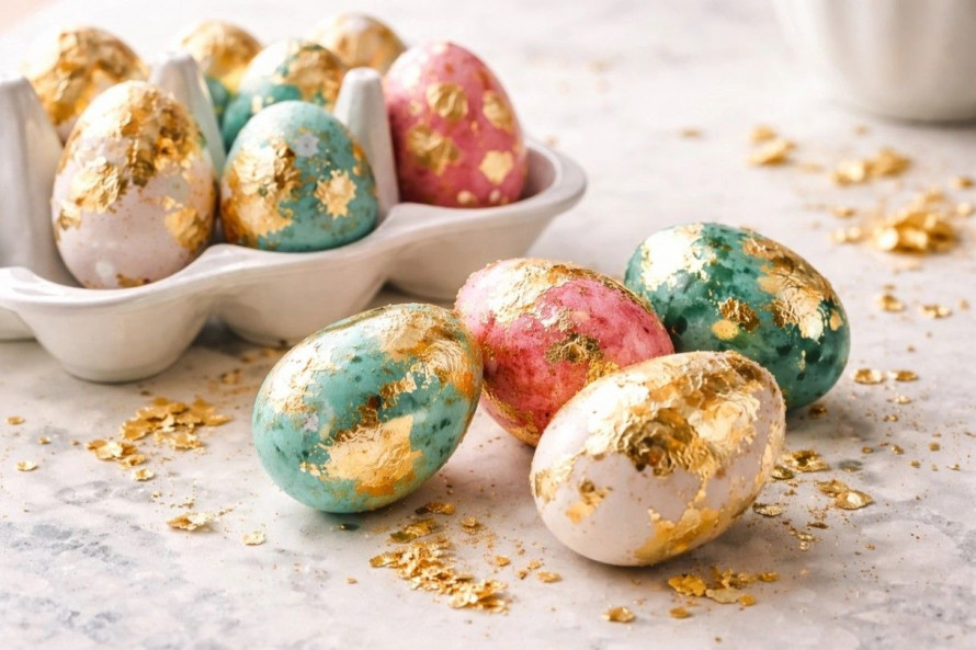 Найпопулярніший метод цього року - фарбування яєць їстівною поталлю . Це надтонкі листи фольги (срібної або золотої), які наносяться на поверхню яйця, створюючи ефект благородного металу або антикварної позолоти.
