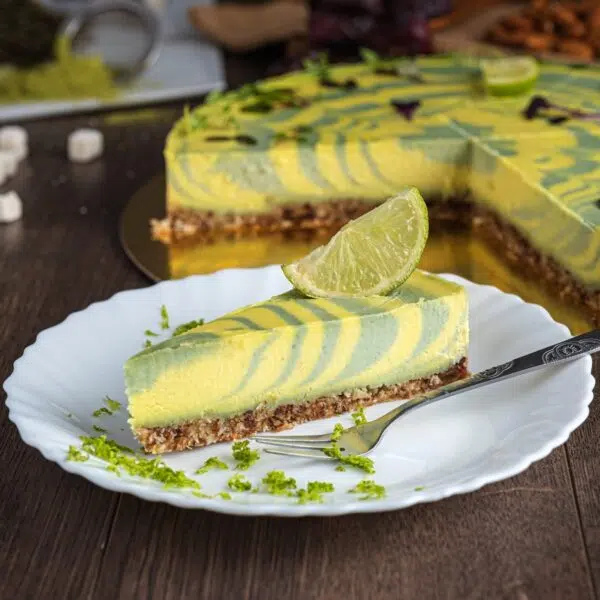 Перед подачею зніміть бортики форми та прикрасьте чізкейк натертою цедрою лайма або листочками м’яти. Якщо хочете додати ще більше «весни» — посипте зверху пелюстками мигдалю. Яскравий колір авокадо не тьмяніє завдяки лимонному соку, тому торт буде виглядати свіжим навіть на наступний день.