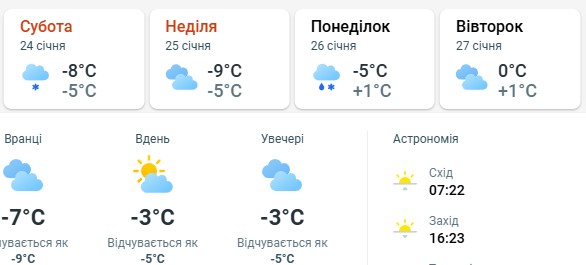 На найближчі вихідні, 24 та 25 січня, мешканцям Кам’янського варто готуватися до стабільно морозної погоди
