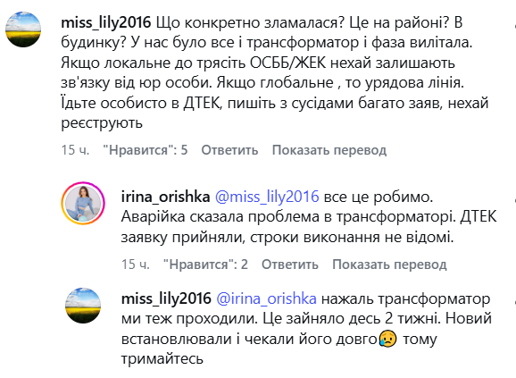 Досвід інших містян свідчить, що подібні поломки трансформаторів можуть усуватися тривалий час. У коментарях до допису зазначають, що в аналогічних ситуаціях заміна обладнання займала близько двох тижнів. Для мешканців багатоповерхівки це означає ще сім днів виживання в холодних квартирах без можливості скористатися елементарними електроприладами.