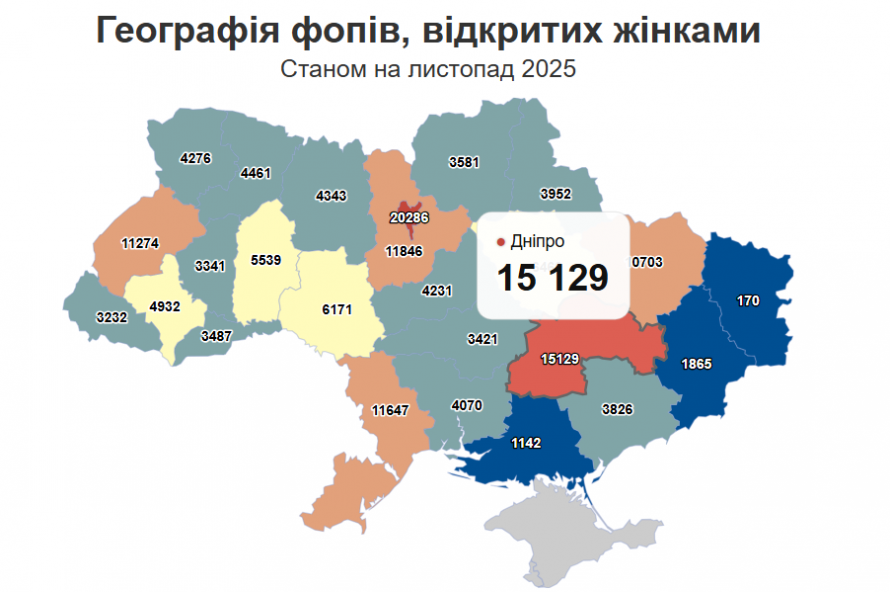 Дніпропетровщина демонструє стабільне зростання підприємницької активності серед жінок. 15 129 нових ФОПів у 2025 році відкрили саме мешканки регіону. Це другий результат в Україні після столиці (20 286).