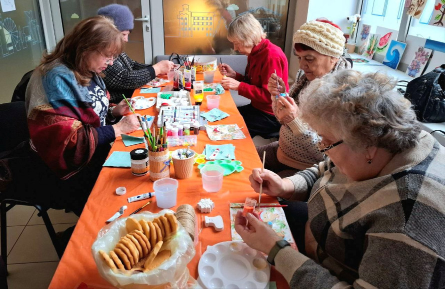 Поважні маріупольці, які відвідують осередок, створювали святковий настрій, розписуючи гіпсові сувеніри. За підтримки психологині центру Оксани Кадук жінки не лише опановували техніку розпису, а й поринули у світ арттерапії. Під пензлями жінок білосніжні фігурки ялинок, новорічних героїв та різдвяних зірок розквітали яскравими барвами, відображаючи унікальний характер кожної учасниці.