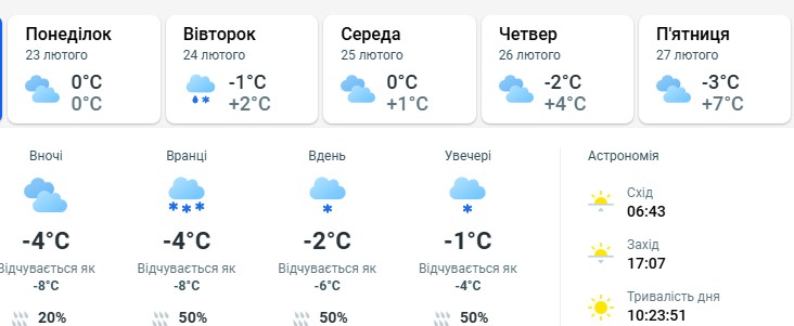 Понеділок, 23 лютого, пройде під знаком похмурого неба. Температура повітря протягом доби коливатиметься від 0°C до -4°C (відчуватиметься як -8°C через вологість). Значних опадів не передбачається, проте висока хмарність утримається до вечора.
