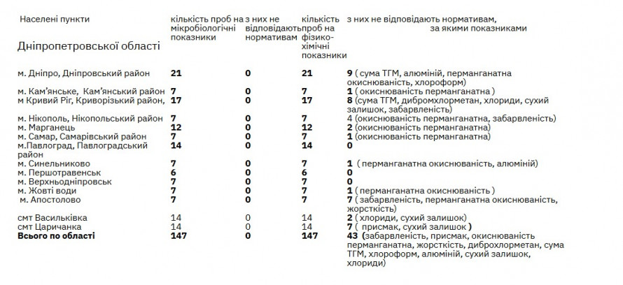 Загалом по Дніпропетровській області за цей період було досліджено 147 проб питної води, з яких 43 мали відхилення за фізико-хімічними показниками. Проте, фахівці зазначають, що ситуація з якістю води в Кам'янському, як і в цілому по області, залишається стабільною і відповідає багаторічним значенням, без будь-яких аномальних змін.