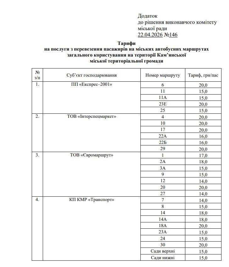 Документ під назвою «Про встановлення тарифів на послуги з перевезення пасажирів на міських автобусних маршрутах загального користування на території Кам’янської міської територіальної громади» було ухвалено на засіданні виконкому 22 квітня.