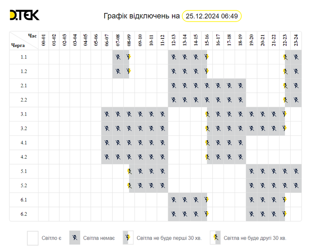 Згідно з інформацією ДТЕК “Дніпровські електромережі”, 25 грудня діє такий графік відключення: